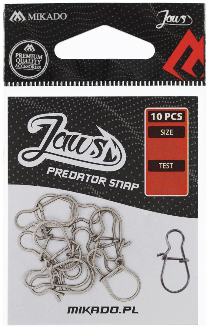 Visokokvalitetna karabina JAWS PREDATOR SNAP marke Mikado, namijenjena prvenstveno za ribolov s varalicom. Zahvaljujući korištenju vrhunskog opružnog čelika, karabina se odlikuje visokom otpornošću i pouzdanošću pri korištenju.