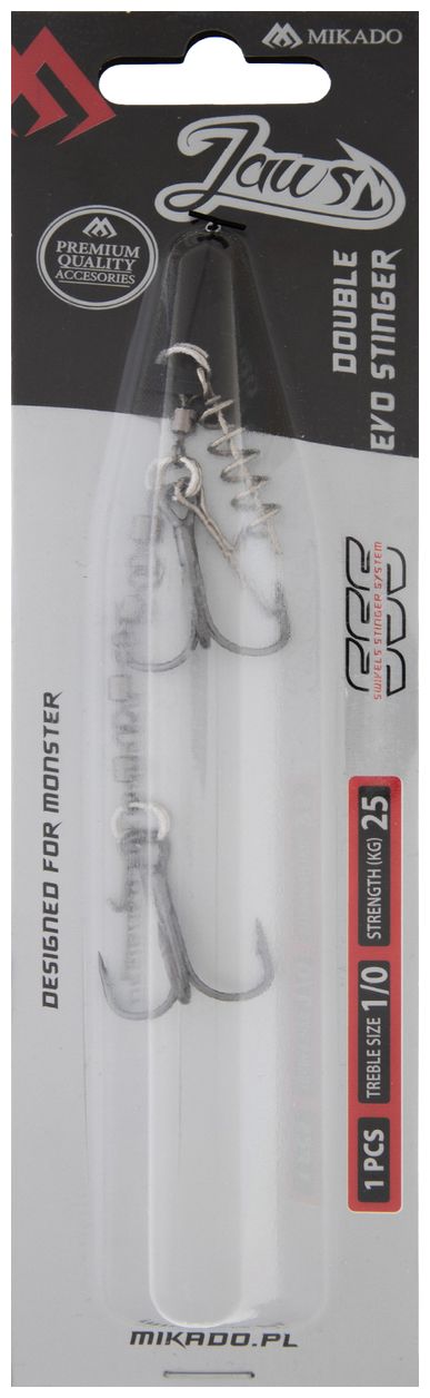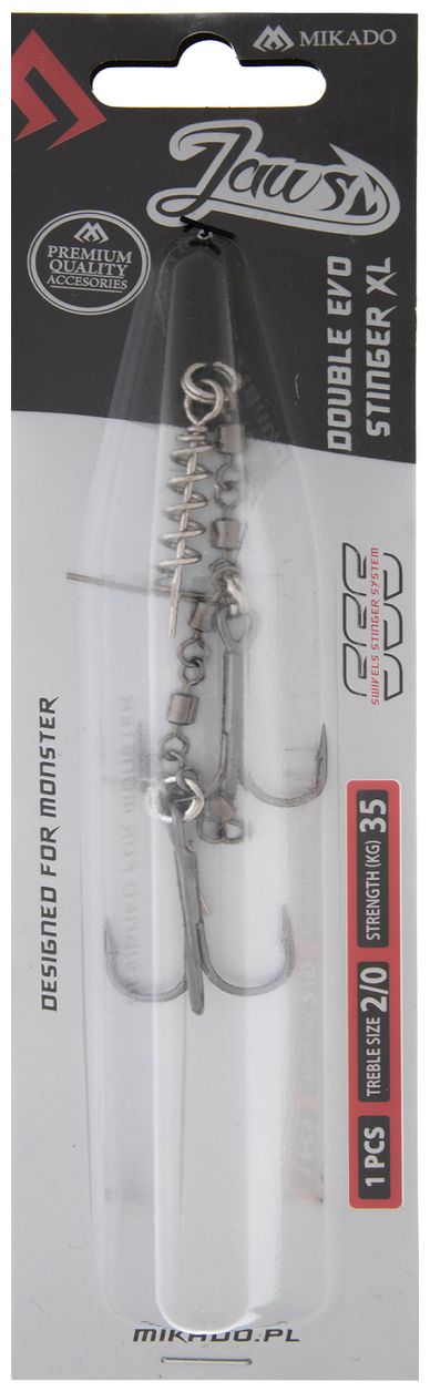 Stinger je opremljen čvrstim trokrakim udicama i dizajniran je za sigurno i stabilno pričvršćivanje mamca tijekom lova grabežljivaca. Zahvaljujući konstrukciji s zavrtavačem (vrtlljem) i iglama, montaža je vrlo pouzdana čak i pri snažnim ugrizima i jakim borbama. Veličina XL je namijenjena za najveće mamce.