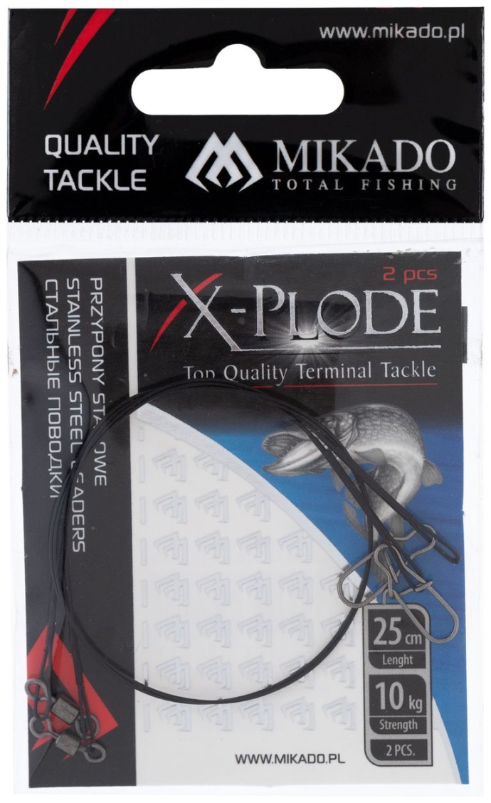 Gotova čelična žica Mikado X-Plode s kuglastim vrtilom, namijenjena prvenstveno za lov grabežljivaca. Čvrsta čelična žica osigurava visoku otpornost na pucanje i oštećenja, kuglasti vrtilo omogućava slobodnije kretanje mamca bez zapetljavanja. Idealna kao gotova najlonska nit za mamce ili kao spojni element u predatorskim montažama.