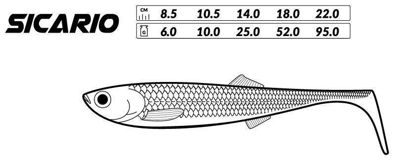 Mamac Sicario je kvalitetan mekani gumeni mamac dizajniran za lov grabežljivaca. Zahvaljujući realističnom izgledu, intenzivnoj akciji repa i izraženom trzaju tijela, značajno povećava šanse za napad predator. Mamac je prikladan za varalice u mirnim i tekućim vodama.
