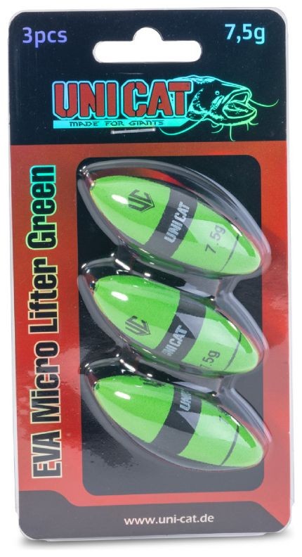 Podvodni plovak Uni Cat EVA Micro Lifter u zelenoj boji je dizajniran za finu prezentaciju mamaca na vodama s visokim ribolovnim pritiskom. Materijal EVA apsorbira atraktante i postupno ih oslobađa, čime povećava privlačnost mamca i šanse za ulov. Ovisno o veličini mamca, na predvezu se može dodati i nekoliko mini plovaka. Aerodinamički dizajn i jasna zelena boja osiguravaju optimalnu vidljivost i u mutnoj vodi, dok diskretan i izdržljiv oblik privlači pažnju riba i u zahtjevnim uvjetima.