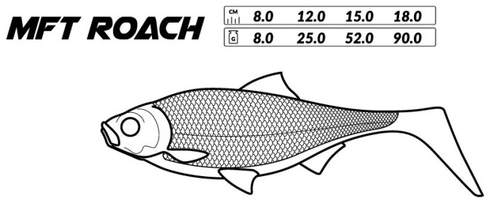 Realistična mekana mamac MFT Roach oponaša pravu ploticu ne samo oblikom, već i pokretom i bojom. U kombinaciji sa jakim titranjem tijela i aktivnim repom osigurava visoku učinkovitost i na oprezne grabežljivce.