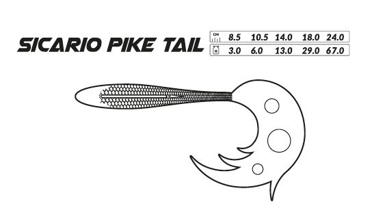 Zahvaljujući realističnom izgledu, intenzivnoj akciji repa i izraženom vibriranju tijela, meki mamac Sicario Pike Tail iznimno je učinkovit u lovu grabežljivih riba. Verzija Pike Tail posebno je pogodna za ciljan lov na ocjeka, soma i štuku.