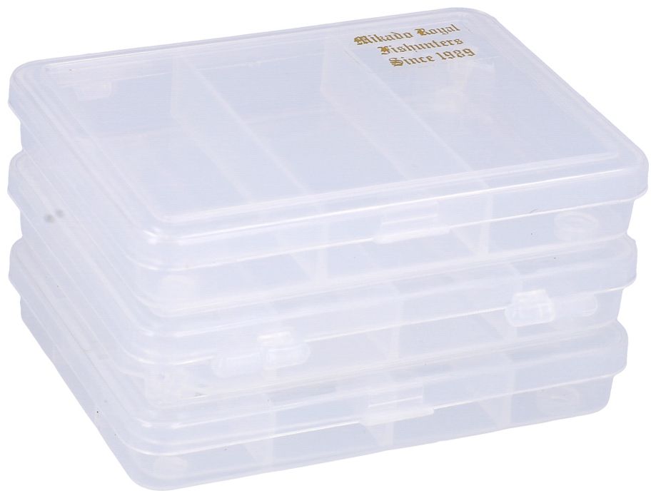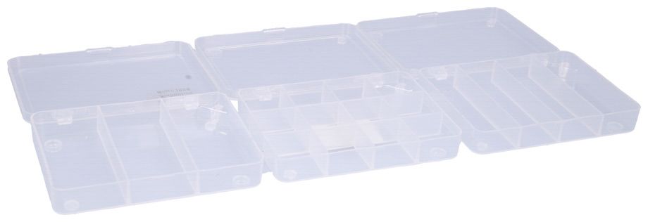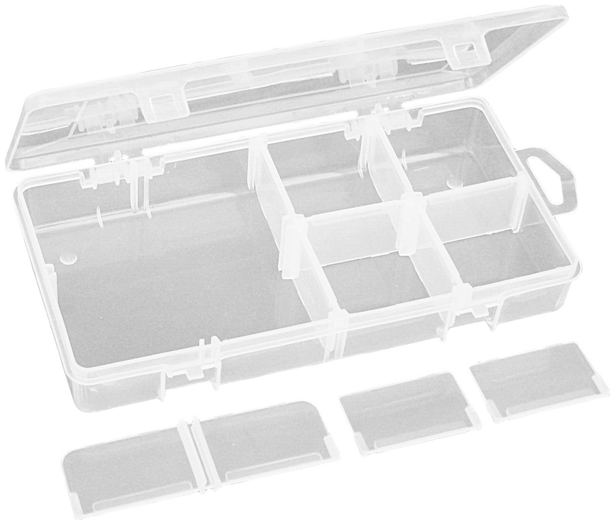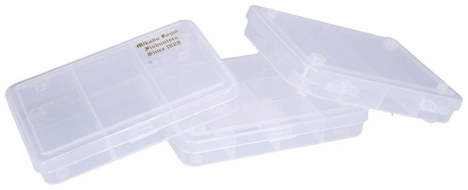 Srednje velika kutija od izdržljive prozirne plastike, dizajnirana za pohranu seta pribora za jedan određeni način ribolova. Kutija je opremljena pomičnim pregradama koje omogućuju reorganizaciju unutarnjeg prostora prema vašim potrebama i postavljanje zasebnih pregrada za pojedinačne woblere ili varalice.