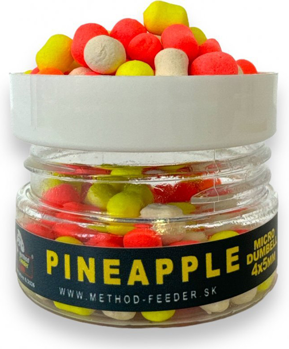 Micro Dumbell je najmanja mamac od svih proizvoda Method Feeder Fans. Njene dimenzije su samo 4 mm x 5 mm. Ima oblik savršenog valjka. U jednom pakiranju možete pronaći četiri provjerene fluo boje ovog malog mamca. Bijela, crvena, žuta i narančasta. Odabrali smo za vas najprimamljivije boje s kojima možete privući i najopreznije ribe pod svim uvjetima. Micro Dumbell je ploveći mamac. Korištenjem prave veličine udice i predveza postići ćete idealnu, neutralno uravnoteženu opremu. Ne samo da nam se pokazalo da, ako se vrh udice dodiruje dno, a mamac se samo lagano nadnosi nad hrpama hrane, takva oprema je neodoljiva i za najopreznije ribe. Micro Dumbell je napravljena tako da se pri zabijanju na trn mamca ne raspada. Preporučujemo, međutim, korištenje finijih trnova. Na ovaj mamac smo izuzetno ponosni. Dvije godine smo tražili idealan, mali mamac. Isprobavali smo, testirali, smišljali i tražili. I usudili bismo se reći da smo uspjeli stvoriti savršen proizvod koji donosimo na tržište s method hranilicama. Micro Dumbell je pakirana u posudi zapremine 25 ml s navojem. Stoga se ne morate bojati da će mamac s vremenom izgubiti svoj miris i idealnu strukturu. Micro Dumbell je savršeno mirisan mamac. Donosimo ga u pet provjerenih okusa, to su ananas, jagoda, češnjak, kril i začinjeno meso.