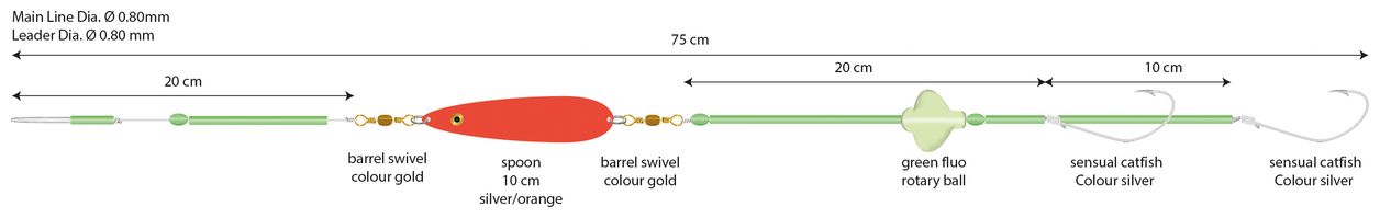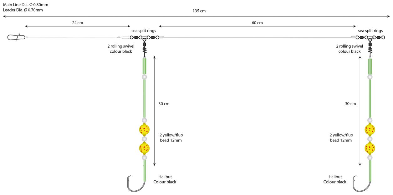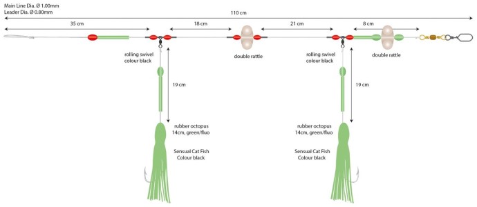 Završena montaža prikladna je kako za lov norveškog bakalara (tzv. "mačke") i velikih škrpina, tako i za manje morski vrste. Nastavak je opremljen fluorescentnom hobotnicom i zvoncem, što olakšava lociranje mamca u velikim dubinama.