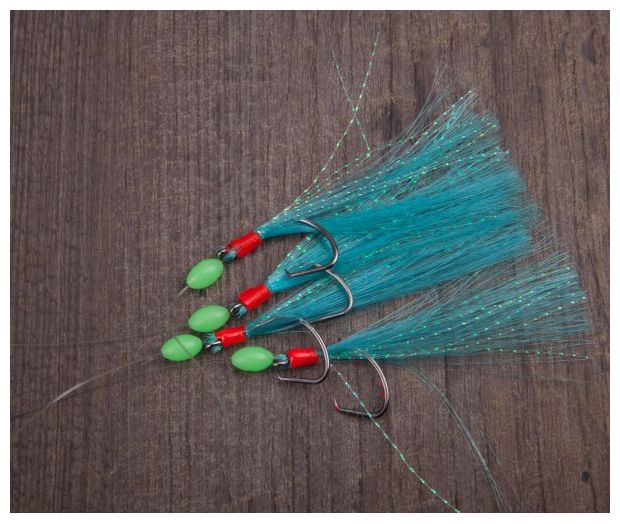 Sustav za lov skuša s tri ili četiri udice. Iznad udice su fluorokarbonske perlice, a na udici je fluorescentna folija s bojama resa.