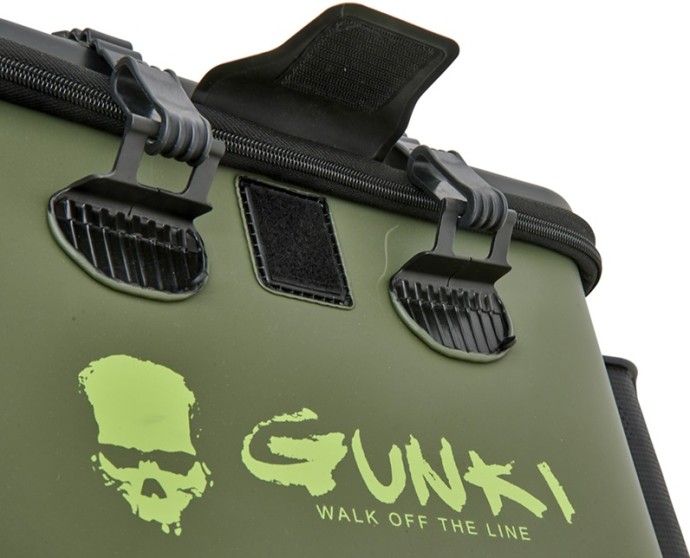 Vodootporna torba Gunki Hard Lid 40 napravljena je od 1,5mm EVA materijala, koji je otporan i pouzdano štiti sadržaj od vode. Model HARD LID 40 ima ojačane zidove i dno opremljeno protukliznim podlošcima. Njegov čvrsti poklopac s preklopima štiti unutrašnjost od kiše, a ujedno služi kao radna površina – rub poklopca prilagođen je za odlaganje SAFE BAG LID ili kutije dimenzija 35×22 cm. Odvojivi i podesivi rameni pojas s sistemom kopči osigurava udobnost i sigurnost prilikom nošenja, a ergonomska ručka olakšava manipulaciju. SAFE BAG PM/MM/GM/LID torbe posebno su dizajnirane kako bi se uklopile u ovaj model i omogućile pregledno i fleksibilno uređenje opreme (prodaju se odvojeno). Dva držača za štapove i džep za kliješta naglašavaju da je ovaj bakkan idealan za ribolovce koji love s čamca, kajaka, paddle boarda ili s obale.