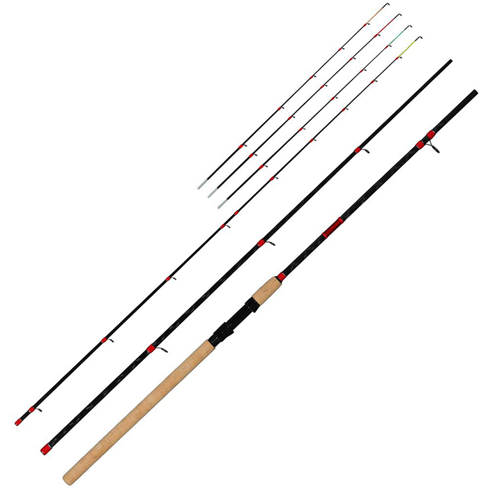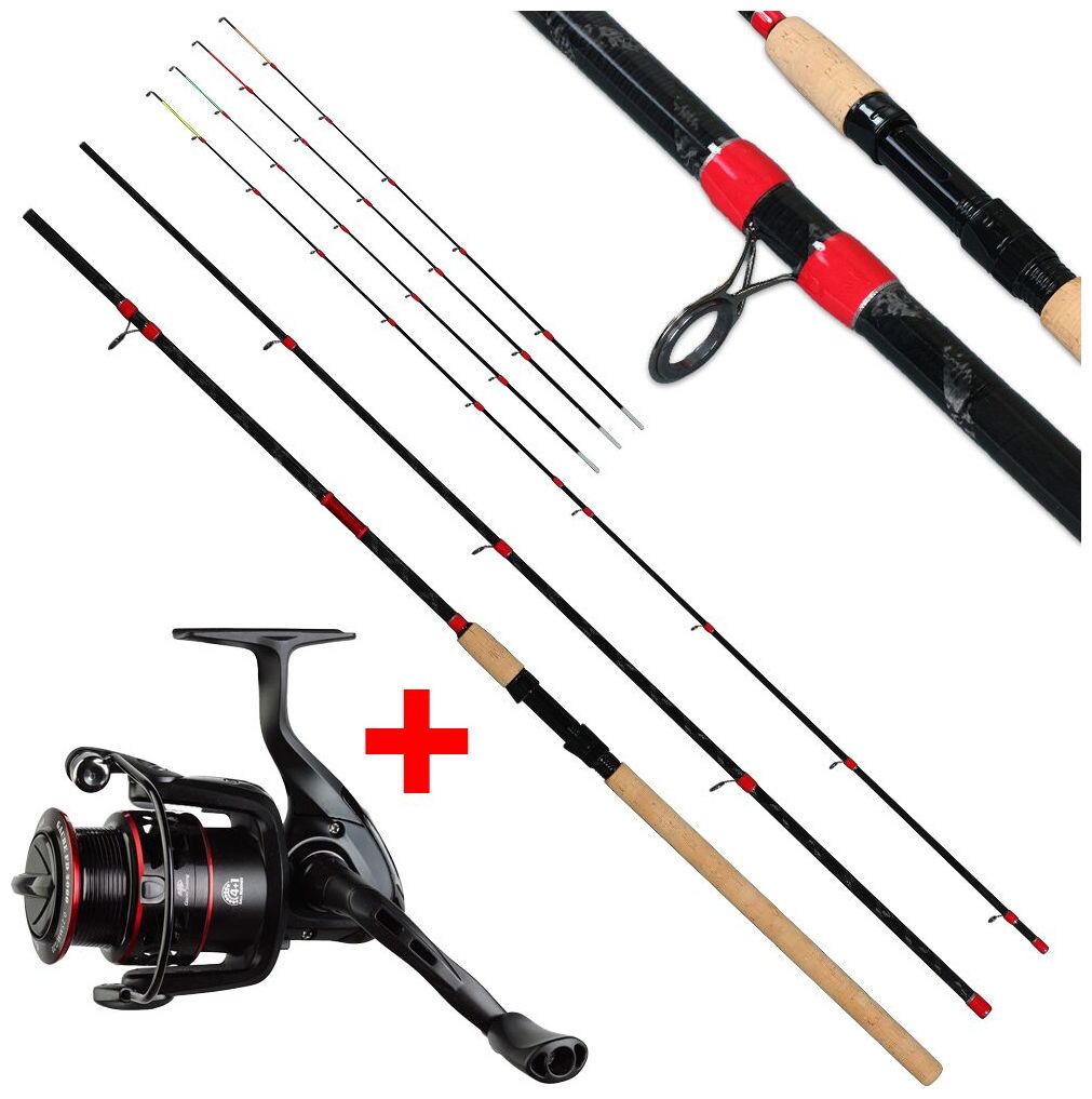 Akcijski set sadrži luksuznu feeder štap s četiri vrhova i kolut s prednjom kočnicom, 4+1 ležajeva i metalnom špulom.