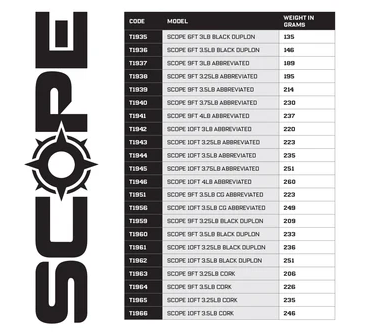 Potpuno nova i proširena serija premijum štapova Scope – izrađena je na blanku od 30 Tonne visoko kvalitetnog karbona s niskim sadržajem smole i vanjskim opletenom od 1k Toray karbonskih vlakana. Kao rezultat toga, dobijen je ekstremno brzi blank i odlična akcija pri borbi s ribom.
