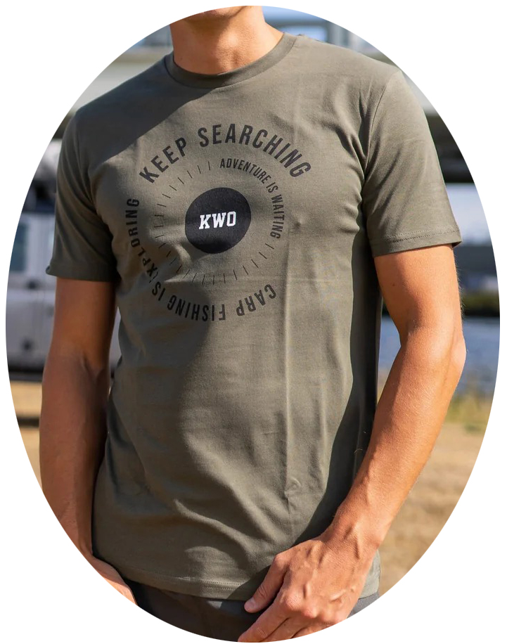 Vojnosiva majica za lov šarana s printom KWO Exploring na prsima. Majica ima okrugli izrez i kratke rukave.